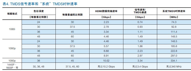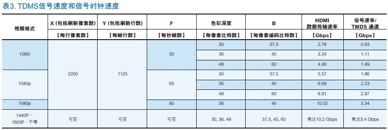 為了說明鏈路數(shù)據(jù)速率和物理TMDS對之間的關(guān)係,表3結(jié)合了表2中的信息與TMDS對信號速度,以及相應的信號時鐘速度。