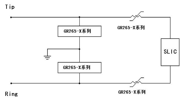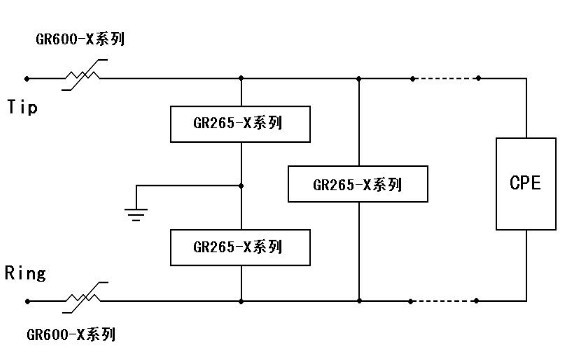 目前本公生產(chǎn)的GR265-X和GR600-X 等系列高分子PTC 熱敏電阻和半導(dǎo)體固體放電管一起用于總配線架的保安單元中,可以滿足過流和過壓保護(hù)的要求,同時(shí)幫助保安單元滿足中國通信行業(yè)標(biāo)準(zhǔn) YD/T 694-1999-2002、北美 TelcordiaGR-974 及 ITU-T K.20 等標(biāo)準(zhǔn),典型的使用電路如上圖所示。