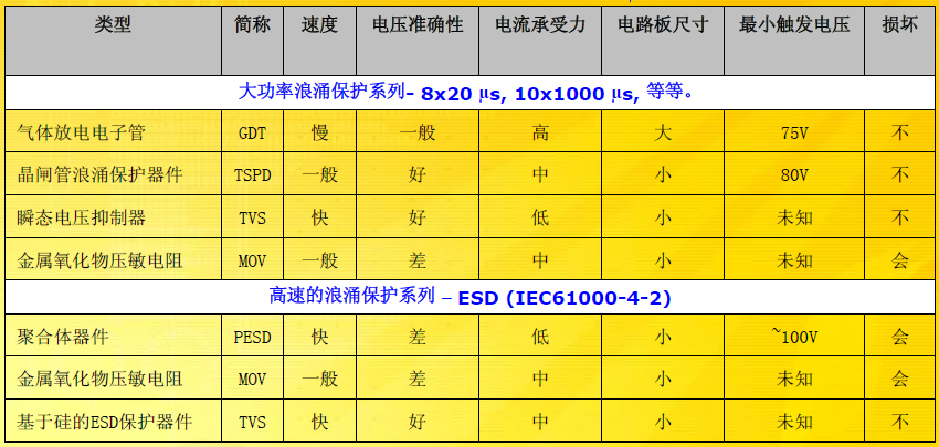 市場上有一系列對電子系統(tǒng)起保護作用的產品。下表簡單描述了各種產品的特征。