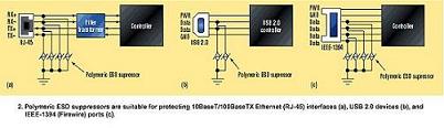 另外,商業(yè)化產(chǎn)品要求在所有不同的硬件接口位置都要有ESD浪涌保護(hù)。例如,一些新型電腦和更高端的消費(fèi)電子可能會(huì)如下這些互連器件的大部分或者全部:以太網(wǎng)、USB1.1/USB2.0、IEEE-1394/1394b、音頻/視頻/RF以及傳統(tǒng)的RS-232、RJ-11等端口等的audio/video/RF端口。所有傳統(tǒng)的保護(hù)器件都已經(jīng)不同程度地得以成功應(yīng)用。但是,如今不斷增長(zhǎng)的工作頻率為超低電容器件(如聚合物抑制器)提出了需求(圖2a)?! ?br />