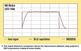 另外,許多新型消費(fèi)電子器件能執(zhí)行快速的IEEE-1394/1394b(Fireware)數(shù)據(jù)轉(zhuǎn)換協(xié)議。這種非常高的數(shù)據(jù)速率(1600 Mbps,1394b)要求低電容ESD抑制器,例如聚合物浪涌器件(圖 2c)。測(cè)試數(shù)據(jù)表明,聚合物ESD抑制器帶來的信號(hào)失真比硅二極管器件保護(hù)Firewire端口產(chǎn)生的更少(圖 3)。