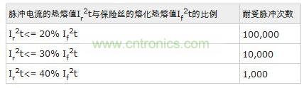 每次脈沖沖擊保險絲,保險絲都會受到一定的損傷,經(jīng)過多次反復沖擊保險絲就會熔斷。以下為AEM產(chǎn)品耐受沖擊次數(shù)的表格: