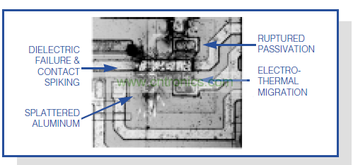 圖1.該顯微圖片表示不帶保護的 RS-232接收器受ESD沖擊后造成的損壞情況