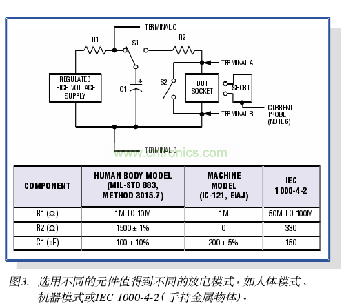 有兩種方法一均符合上述要求一已被設備制造商廣泛采用,來測試I/O端口的ESD防護能力(圖3)第一種方法修改自Method 3015.7 > MIL-STD-883它采用了與原來方法相同的電路模型和波形,但只將ESD脈沖施加于器件的I/o引腳。這種方法的口的是模擬已安裝于線路板并運行于口標系統(tǒng)中的Ic所遭遇的故障電流。
