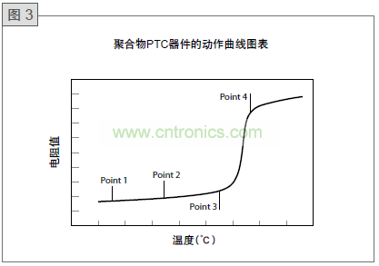 當(dāng)電流或環(huán)境溫度再提高時,PolySwitch器件會達(dá)到一個較高的溫度如圖Point 3所示。若此時電流或環(huán)境溫度繼續(xù)增加,產(chǎn)生的