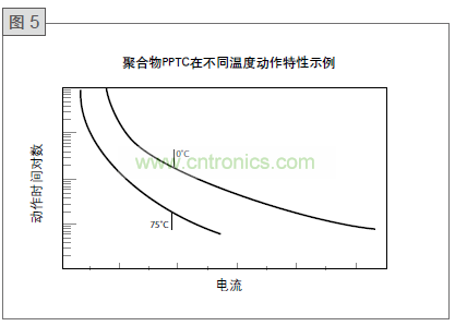 圖5顯示了在0℃和75℃下的靜止空氣中聚合PTC器件的一對典型運(yùn)行曲線對。這些曲線是不同的,因?yàn)樾枰獎幼髌骷臒崃縼碜?br /> 電氣I2R加熱和器件環(huán)境。75℃時環(huán)境的熱量輸入要比0℃的熱量輸入大得多,因此動作所需要的附加I2R相對較少,造成在給定的動作時間內(nèi)的較低的動作電流(或在給定的動作電流下動作更快)。