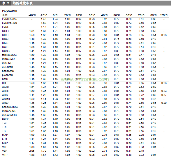 確保應(yīng)用場合的最小和最大環(huán)境溫度在PolySwitch器件的操作溫度范圍內(nèi)。大多數(shù)PolySwitch器件的操作溫度范圍介于-40℃到85℃,某些特殊情況下會達(dá)到125℃。