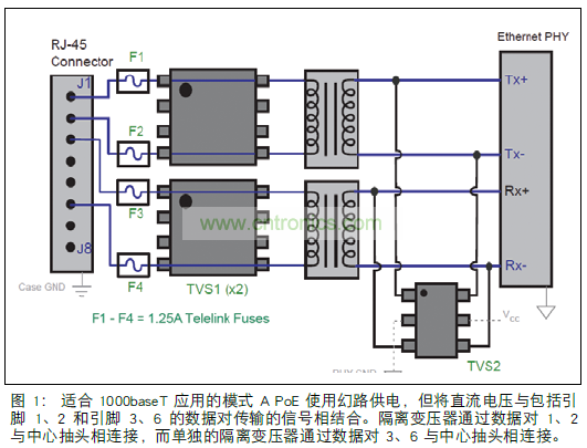 不采用縱向模式的方法可能只要求一個數(shù)據(jù)對安裝一根保險絲,適用于較低數(shù)據(jù)速率的以太網(wǎng),例如 10BaseT。 對于 100 和 1000BaseT 系統(tǒng),謹(jǐn)慎起見,將相同的保險絲組件置于數(shù)據(jù)對的兩個引腳中,以保護(hù)回路平衡。
