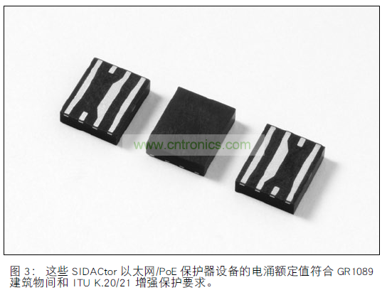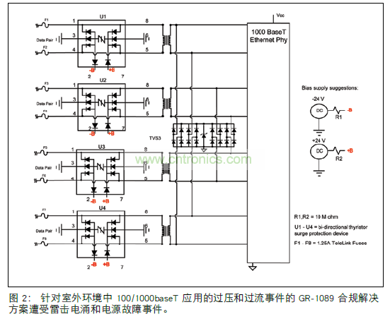 數(shù)據(jù)對導(dǎo)線中的保險絲提供必要的過流保護(hù),對一級 GR-1089 事件的雷擊引起的過壓電涌不敏感。 雙向半導(dǎo)體晶閘管電涌保護(hù)設(shè)備 IC1 至 IC4 或 SIDACtor設(shè)備(參見圖3.)提供過壓消弧保護(hù)方法,根據(jù) GR-1089 第 6 版,這種方法符合一級和二級雷擊電涌。