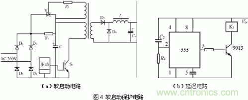 開關穩(wěn)壓電源的電路比較復雜,開關穩(wěn)壓器的輸入端一般接有小電感、大電容的輸入濾波器。在開機瞬間,濾波電容器會流過很大的浪涌電流,這個浪涌電流可以為正常輸入電流的數(shù)倍。這樣大的浪涌電流會使普通電源開關的觸點或繼電器的觸點熔化,并使輸入保險絲熔斷。另外,浪涌電流也會損害電容器,使之壽命縮短,過早損壞。為此,開機時應該接入一個限流電阻,通過這個限流電阻來對電容器充電。為了不使該限流電阻消耗過多的功率,以致影響開關穩(wěn)壓器的正常工作,而在開機暫態(tài)過程結(jié)束后,用一個繼電器自動短接它,使直流電源直接對開關穩(wěn)壓器供電,這種電路稱之謂直流開關電源的 “ 軟啟動 ” 電路。如圖 4 ( a )所示在電源接通瞬間,輸入電壓經(jīng)整流橋( D1 ~ D4 )和限流電阻 R1 對電容器 C 充電,限制浪涌電流。當電容器 C 充電到約 80 %額定電壓時,逆變器正常工作.經(jīng)主變壓器輔助繞組產(chǎn)生晶閘管的觸發(fā)信號,使晶閘管導通并短路限流電阻 R1,開關電源處于正常運行狀態(tài).為了提高延遲時間的準確性及防止繼電器動作抖動振蕩,延遲電路可采用圖 4 ( b )所示電路替代 RC 延遲電路.。