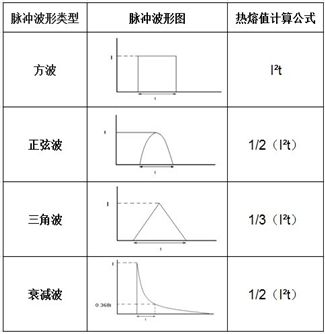 表2是幾種常見脈沖波形的計(jì)算公式。脈沖電流的熱熔值可以通過對(duì)脈沖電流波形數(shù)據(jù)的積分計(jì)算得到。