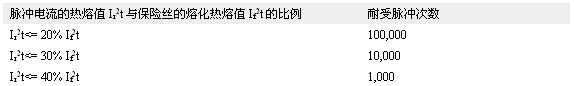 由于脈沖電流通過保險(xiǎn)絲的時(shí)候,會(huì)產(chǎn)生熱量,所以雖然單次脈沖的能量不足以使保險(xiǎn)絲熔斷,但多次脈沖沖擊會(huì)導(dǎo)致保險(xiǎn)絲熔斷。為了保證保險(xiǎn)絲可以耐受規(guī)定次數(shù)的脈沖電流,需要依據(jù)表3中所示的脈沖折減系數(shù)計(jì)算保險(xiǎn)絲的I2t規(guī)格。如果脈沖發(fā)生時(shí),保險(xiǎn)絲所處環(huán)境溫度高于室溫(+25°C),須做相應(yīng)的溫度折減。