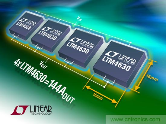 ●利用多個 LTM4630 實現(xiàn)多相并聯(lián)均流,電流可高達(dá) 144A