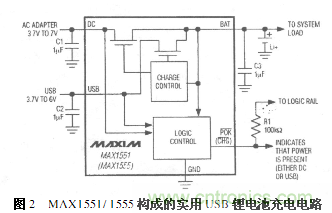 圖2是由MAX1551/1555構(gòu)成的一種實(shí)用USB鋰電池充電電路。MAX1551/1555是MAXIM公司設(shè)計(jì)生產(chǎn)的USB單節(jié)鋰電池充電芯片,為5引腳薄型SOT23封裝,允許USB接口或者墻壁AC適配器3.7V~7V范圍的電壓輸入。芯片內(nèi)部還具有溫度限制電路。