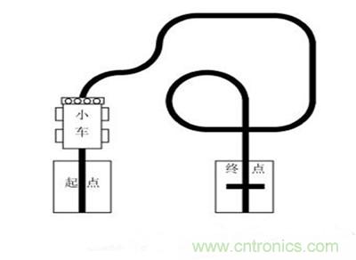 所謂小車循跡,就是在白紙上畫出黑色的線條,稱為賽道;小車沿著賽道按要求(可以做一些指定的任務(wù))行進(jìn)時,能自動識別賽道并按賽道線條行走,稱為小車循跡。如圖1所示,該賽道是2010年全國職業(yè)院校大學(xué)生職業(yè)技能競賽月球車競賽項目湖南賽區(qū)賽道圖。