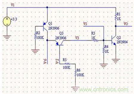 若Q1和Q3基極同時為低時,Q2導(dǎo)通而使得VO為0造成晶振停振關(guān)閉處理器。我們分析R3和R4(實(shí)際電路470K)使得Q2和Q3處于飽和態(tài);Q3為Q1集電極負(fù)載,調(diào)整R5阻值時可控制Q1處于飽和態(tài)或放大態(tài)。要使Q2基極導(dǎo)通必須使Q1提供足夠大電流才滿足條件,只有Q1處于放大態(tài)才滿足條件;