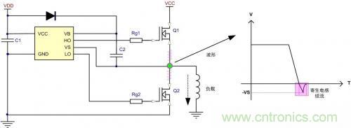 上圖為典型的半橋自舉驅(qū)動電路,由于寄生電感的存在,在高端MOS關(guān)閉后,低端MOS的體二極管鉗位之前,寄生電感通過低端二極管進行續(xù)流,導致VS端產(chǎn)生負壓,且負壓的大小與寄生電感與成正比關(guān)系。該負壓會把驅(qū)動的電位拉到負電位,導致驅(qū)動電路異常,還可能讓自舉電容過充電導致驅(qū)動電路或者柵極損壞。由于IC的驅(qū)動端通常都有寄生二極管,當瞬間的大電流流過驅(qū)動口的二極管時,很可能引發(fā)寄生SCR閉鎖效應,導致驅(qū)動電路徹底損壞。