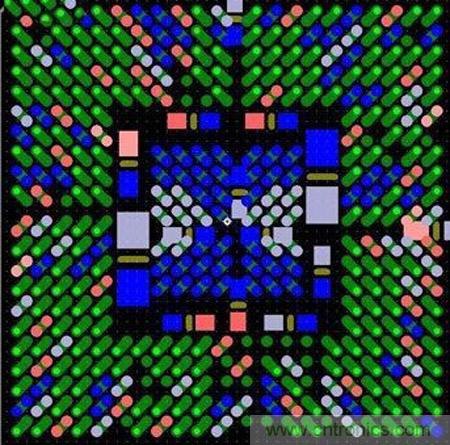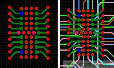 圖6:這種扇出方法避免了使用高端技術(shù),而且不會(huì)影響信號(hào)完整性。BGA引腳分成內(nèi)部引腳和外部引腳兩部分。