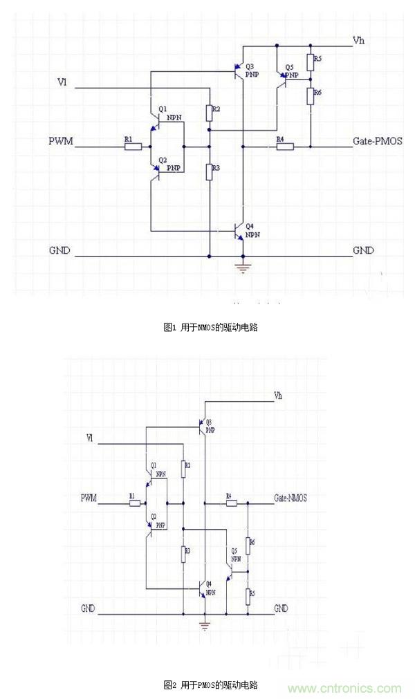 這里我只針對(duì)NMOS驅(qū)動(dòng)電路做一個(gè)簡(jiǎn)單分析:Vl和Vh分別是低端和高端的電源,兩個(gè)電壓可以是相同的,但是Vl不應(yīng)該超過(guò)Vh。Q1和Q2組成了一個(gè)反置的圖騰柱,用來(lái)實(shí)現(xiàn)隔離,同時(shí)確保兩只驅(qū)動(dòng)管Q3和Q4不會(huì)同時(shí)導(dǎo)通。 R2和R3提供了PWM電壓基準(zhǔn),通過(guò)改變這個(gè)基準(zhǔn),可以讓電路工作在PWM信號(hào)波形比較陡直的位置。 Q3和Q4用來(lái)提供驅(qū)動(dòng)電流,由于導(dǎo)通的時(shí)候,Q3和Q4相對(duì)Vh和GND最低都只有一個(gè)Vce的壓降,這個(gè)壓降通 常只有0.3V左右,大大低于0.7V的Vce。 R5和R6是反饋電阻,用于對(duì)gate電壓進(jìn)行采樣,采樣后的電壓通過(guò)Q5對(duì)Q1和Q2的基極產(chǎn)生一個(gè)強(qiáng)烈的負(fù)反饋, 從而把gate電壓限制在一個(gè)有限的數(shù)值。這個(gè)數(shù)值可以通過(guò)R5和R6來(lái)調(diào)節(jié)。