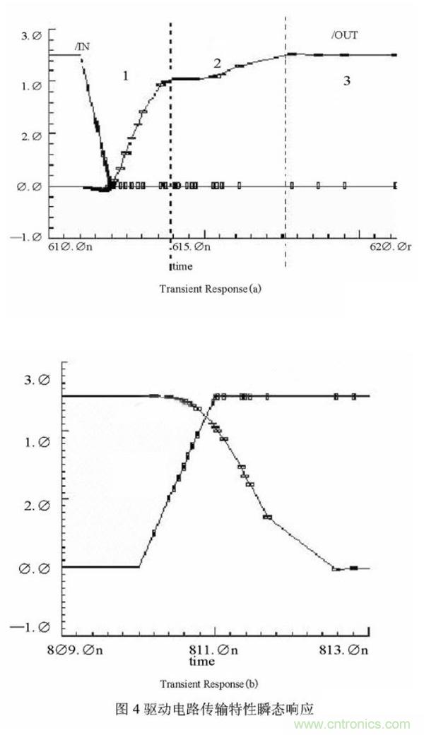 驅(qū)動(dòng)電路的傳輸特性瞬態(tài)響應(yīng)在圖4中給出。其中(a)為上升沿瞬態(tài)響應(yīng),(b)為下降沿瞬態(tài)響應(yīng)。從圖4中可以看出,驅(qū)動(dòng)電路上升沿明顯分為了三個(gè)部分,分別對(duì)應(yīng)三個(gè)上拉驅(qū)動(dòng)管起主導(dǎo)作用的時(shí)期。1階段為Q1、N4共同作用,輸出電壓迅速抬升,2階段為N4起主導(dǎo)作,使輸出電平達(dá)到VDD,3階段為P5起主導(dǎo)作用,維持輸出高電平為VDD。而且還可以縮短上升時(shí)間,下降時(shí)間滿(mǎn)足工作頻率在兆赫茲級(jí)以上的要求。