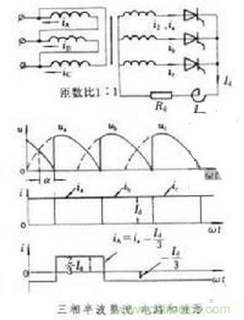 由圖可見,變壓器次級繞組電流i2可以分解成直流分量i2=和交流分量i。由于直流分量i2≈只能產(chǎn)生直流磁通勢,所以它無法影響初級電流作相應(yīng)變化。而交流分量 i將通過變壓器的磁耦合反映到初級電流中去。這樣,初、次級電流有效值分別為I1=Id/3、I2=Id/。在α=0°和不考慮電網(wǎng)電壓波動等情況下,得S2=1.48Pd、S1=1.21Pd、S=1.345Pd, 其中Pd為整流功率。在三相橋式電路中,次級無直流分量電流,所以初、次級電流是波形相同的交流電,故S=1.05Pd,可見橋式接線時變壓器利用率提高。