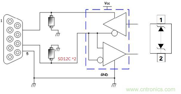 RS232接口一般為內(nèi)部配置接口,或短距離低速通信口,但此接口經(jīng)常插拔,需要采用功率300W以上產(chǎn)品進(jìn)行靜電和浪涌保護(hù),所以需采用SOD-323封裝的SD12C或SD15C(根據(jù)客戶芯片的工作電壓波動(dòng)不同)來保護(hù)收發(fā)2路信號(hào)。