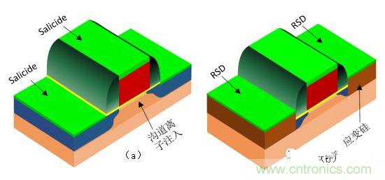 隨著MOS器件的特征尺寸不斷縮小到90nm及以下時,短溝道效應(yīng)中的器件亞閾值電流成為妨礙工藝進(jìn)一步發(fā)展的主要因素,盡管提高溝道摻雜濃度可以在一定程度上抑制短溝道效應(yīng),然而高摻雜的溝道會增大庫倫散射,使載流子遷移率下降,導(dǎo)致器件的速度降低,所以僅僅依靠縮小MOS器件的幾何尺寸已經(jīng)不能滿足器件性能的提高,需要一些額外的工藝技術(shù)來提高器件的電學(xué)性能,例如應(yīng)變硅技術(shù)。應(yīng)變硅技術(shù)是通過外延生長在源漏區(qū)嵌入應(yīng)變材料使溝道發(fā)生應(yīng)變,從而提高載流子遷移率,最終提高器件的速度。例如NMOS的應(yīng)變材料是SiC,PMOS的應(yīng)變材料是SiGe。另外,隨著源漏的結(jié)深的短減小,源漏擴散區(qū)的厚度已經(jīng)不能滿足形成Salicide的最小厚度要求,必須利用新技術(shù)RSD(Raise Source and Drain)技術(shù)來增加源漏擴散區(qū)的厚度。RSD技術(shù)是通過外延技術(shù)生長在源漏區(qū)嵌入應(yīng)變材料的同時提高源漏擴散區(qū)的厚度。如圖1.15(b)所示,是采用應(yīng)變硅和RSD技術(shù)的MOS管結(jié)構(gòu)圖。