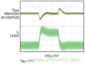 圖 3:LTC3895 在 12V 輸出、2A 階躍負(fù)載時(shí)的瞬態(tài)響應(yīng)
