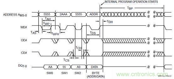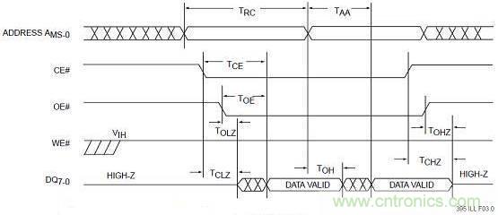 從圖中我們可以看出ADDRESS是表示地址總線(xiàn)的,DQ是表示數(shù)據(jù)總線(xiàn)的,CE是片選信號(hào),且是低電平有效,其寬度要保證在進(jìn)行讀操作時(shí)總是有效的。學(xué)會(huì)看時(shí)序圖對(duì)于做嵌入式系統(tǒng)開(kāi)發(fā)非常有幫助,因?yàn)槲覀儾豢杀苊獾囊c芯片打交道。在時(shí)序圖中,通常會(huì)標(biāo)識(shí)很多的時(shí)間需求信息。在寫(xiě)啟動(dòng)代碼時(shí)需要初始化各地址空間的片選地址寄存器和讀寫(xiě)時(shí)序,時(shí)序的配置依據(jù)就是來(lái)自于外設(shè)芯片的時(shí)間需求,這是芯片手冊(cè)很重要的一部分內(nèi)容。當(dāng)一個(gè)地址空間中存在多個(gè)外設(shè)芯片時(shí),我們需要考慮到其中最慢的外設(shè)芯片的時(shí)間需求,否則的話(huà)有的芯片就不能正常工作。