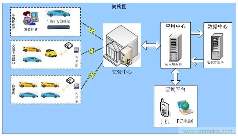 正是由于電子車牌相比傳統(tǒng)車牌有這么多的優(yōu)勢和特點(diǎn),可以預(yù)見在不久的將來,機(jī)動(dòng)車輛將會(huì)逐步使用帶有電子標(biāo)簽的電子車牌替代目前的傳統(tǒng)車牌,這樣一來,從車輛前端的電子車牌,到后端的車牌識(shí)別、數(shù)據(jù)傳輸、車輛管理、數(shù)據(jù)存儲(chǔ)、終端查詢等整個(gè)平臺(tái)的構(gòu)建和發(fā)展前景都是十分廣闊的,圖2是整個(gè)平臺(tái)組成架構(gòu)的示意圖。