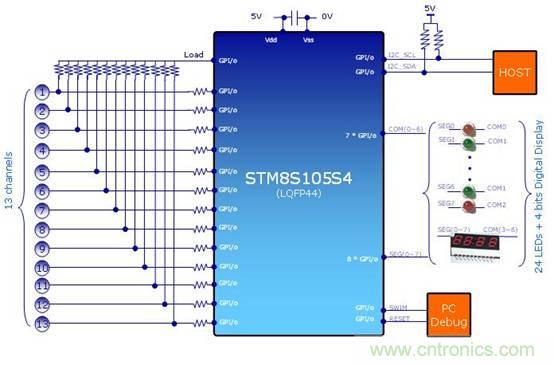 相較于機械式按鍵和電阻式觸摸按鍵,電容式觸摸按鍵不僅耐用,造價低廉,機構簡單易于安裝,防水防污,而且還能提供如滾輪、滑動條的功能。但是電容式觸摸按鍵也存在很多的問題,因為沒有機械構造,所有的檢測都是電量的微小變化,所以對各種干擾敏感得多。ST針對家電應用特別是電磁爐應用,推出了一個基于STM8系列8位通用微控制器平臺的電容式觸摸感應方案,無需增加專用觸摸芯片,僅用簡單的外圍電路即可實現(xiàn)電容式觸摸感應功能,方便客戶二次開發(fā)。