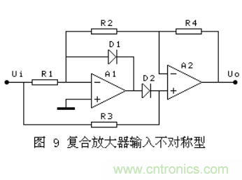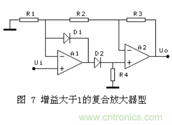圖7,8,9三種電路,當運放A1輸出為正時,A1的負反饋是通過二極管D2和運放A2構(gòu)成的復(fù)合放大器構(gòu)成的,由于兩個運放的復(fù)合(乘積)作用,可能環(huán)路的增益太高,容易產(chǎn)生振蕩。