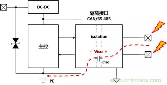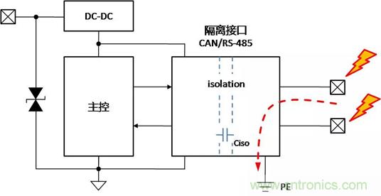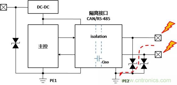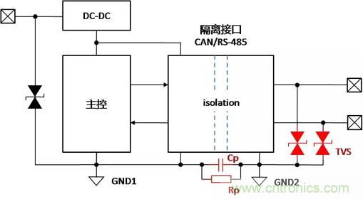 帶隔離通信接口的設(shè)備,在不同的使用、安裝狀態(tài)下,接口會表現(xiàn)出完全不同的ESD特性,了解設(shè)備在不同的使用狀態(tài)下,ESD對接口的影響的機理,才能有針對性地增加保護器件,提升隔離接口的ESD能力。下面以帶有隔離CAN或RS-485通信接口為例,對常見的設(shè)備狀態(tài)下,ESD的作用機理進行分析,并提出相應的改善措施。