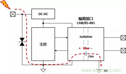 當總線側(cè)接口受到靜電放電時,靜電能量通過隔離接口模塊內(nèi)部總線側(cè)器件泄放至PE,如圖 7。若ESD能量超出了接口模塊內(nèi)部總線側(cè)器件的ESD抗擾能力,總線接口則可能損壞。