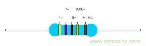 所以,黃色在第一環(huán)就是4,第二環(huán)紫色為7,第三環(huán)黑色是0,第四環(huán)就是乘積了10的3次方也就是1000,第五環(huán)是誤差了棕色為±1%?,F(xiàn)在我們來計算阻值:470*1000=470K,然后誤差是±1%,所以阻值的范圍是在465.3K—— 474.7K之間,其阻值都是正常的。
