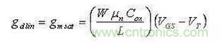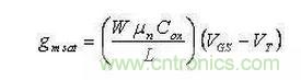 而飽和區(qū)的柵極跨導(dǎo)——飽和跨導(dǎo)gmsat是表征著在溝道夾斷情況下、柵-源電壓對源-漏電流的控制能力,這時剩余溝道的寬度已經(jīng)是不均勻的,則這種控制也相當(dāng)于是通過溝道寬度發(fā)生不均勻變化而起作用的,因此這時的柵極跨導(dǎo)就等效于線性區(qū)源-漏電導(dǎo):