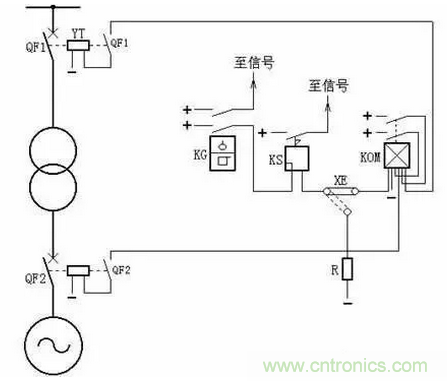 再有,連接片XE也可接至電阻R,使重瓦斯保護(hù)不投跳閘而只發(fā)信號。