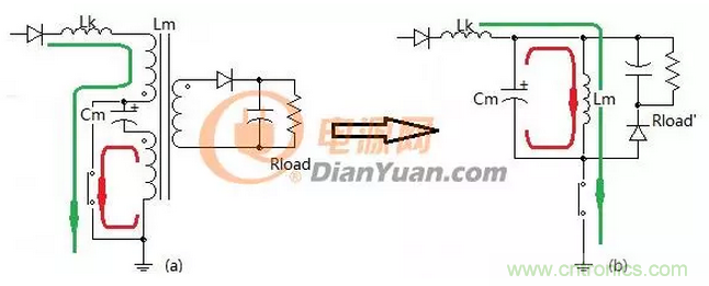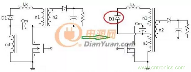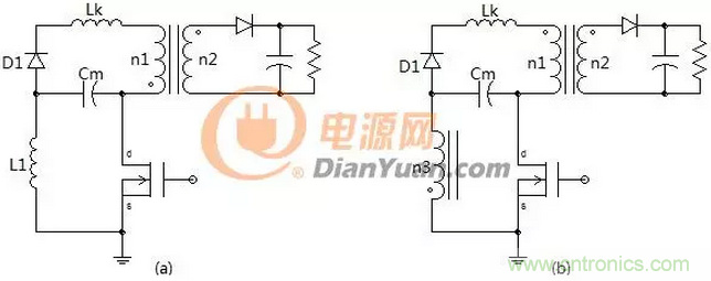 圖2中的兩個電路是一樣的只是形式不同,如果去掉電容Cm電路的左側(cè)就如同一個帶去磁繞組的正激變壓器初級側(cè),同樣這里的線圈n1、n3也要采用雙線并繞,如果兩線圈耦合的好二極管D1是可以省掉的,如果耦合的不好就會產(chǎn)生圖1中(a)的效果會有一部分無功損耗。