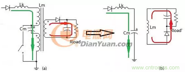 見圖4-1-2中的(b)等效電路,在開關(guān)關(guān)斷期間輸入和輸出可視為兩個獨立的電路,輸入側(cè)漏感Lk的能量被電容Cm吸收,輸出側(cè)電感Lm對負(fù)載釋放能量。