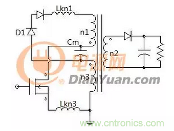 在前面圖2中初級線圈n1、n3是采用雙線并繞,在這個應(yīng)用中不采用并繞的方式或者是額外引入漏感使n1、n3線圈都寄生有漏感,電路如下: