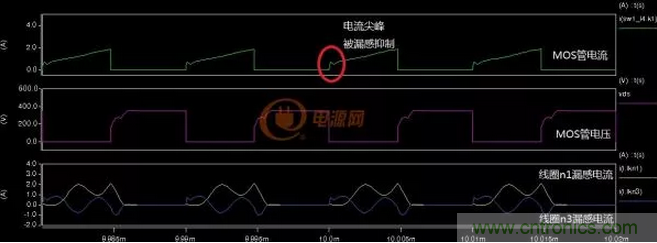 從圖4-2-4中可以看出增加的漏感Lkn3很好的抑制了電流尖峰,不過漏感Lkn3上的能量只能傳遞回電源形成無功功率,好在這部分能量不大無功損耗也就更小了。