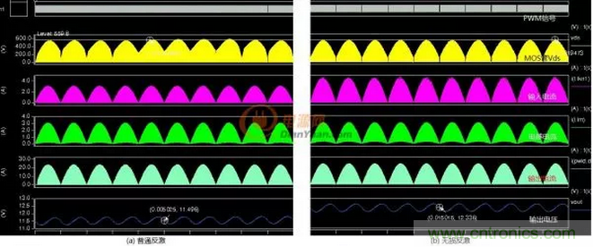 上圖中(a)普通反激電路Vds有尖峰電壓這是漏感造成的,圖(b)無損吸收則沒有這個電壓尖峰,而且只用了18nF的電容。兩種電路都采用的是臨界模式控制,輸入電流、輸出電流都是斷續(xù)的,輸出電壓上疊加有工頻紋波。