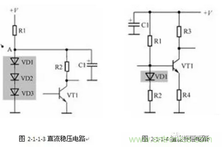 二極管簡(jiǎn)易穩(wěn)壓電路中主要利用二極管的管壓降基本不變特性。二極管的管壓降特性:二極管導(dǎo)通后其管壓降基本不變,對(duì)硅二極管而言這一管壓降是0.6V左右,對(duì)鍺二極管而言是0.2V左右。上圖所示是由普通3只二極管構(gòu)成的簡(jiǎn)易直流穩(wěn)壓電路。電路中的VD1、VD2和VD3是普通二極管,它們串聯(lián)起來(lái)后構(gòu)成一個(gè)簡(jiǎn)易直流電壓穩(wěn)壓電路。圖2-1-1-3.