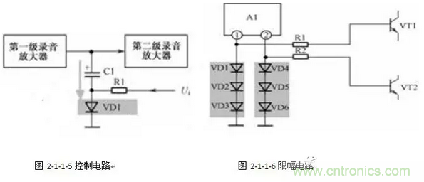 二極管導(dǎo)通之后,它的正向電阻大小隨電流大小變化而有微小改變,正向電流愈大,正向電阻愈小;反之則大。利用二極管正向電流與正向電阻之間的特性,可以構(gòu)成一些自動(dòng)控制電路。如圖9-43所示是一種由二極管構(gòu)成的自動(dòng)控制電路,又稱ALC電路(自動(dòng)電平控制電路),它在磁性錄音設(shè)備中(如卡座)的錄音電路中經(jīng)常應(yīng)用。圖2-1-1-5。