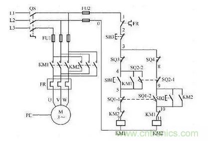 這個電路也很經(jīng)典,其實它是控制電機正反轉(zhuǎn)的加強版。利用行程開關(guān)實現(xiàn)自動往返的效果,按下SB1啟動按鈕KM1自鎖,小車開始正向走,當碰到限位開關(guān)SQ1時,KM1線圈失電KM2自鎖,小車又反向運行。只要不按下SB3這個停止按鈕,它就會循環(huán)運行。
