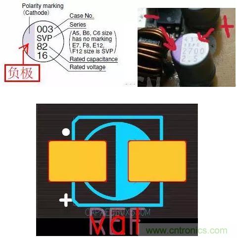 在PCB板上,白色標(biāo)志為負(fù),有+號(hào)的一端為正。其實(shí)啊,還是不要管什么標(biāo)示,誰知道你有沒有畫錯(cuò)PCB,或封裝畫錯(cuò),老老實(shí)實(shí)回到電路上面去,正電源進(jìn)去和出來都接電容正極,電容負(fù)極接地。負(fù)電源輸入和輸出都接電容負(fù)極,電容正極接地。
