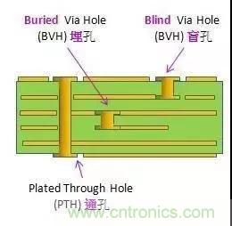 這個(gè)制作過程不能通過電路板黏合后再進(jìn)行鉆孔的方式達(dá)成,必須要在個(gè)別電路層的時(shí)候就進(jìn)行鉆孔操作,先局部黏合內(nèi)層之后進(jìn)行電鍍處理,最后全部黏合。由于操作過程比原來的導(dǎo)通孔和盲孔更費(fèi)勁,所以價(jià)格也是最貴的。這個(gè)制作過程通常只用于高密度的電路板,增加其他電路層的空間利用率。