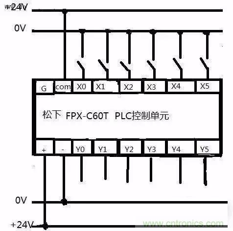 圖中松下PLC為直流匯點式輸入,即所以輸入點共用一個公共端COM,同時COM端內帶有DC24V電源,在編寫程序時注意外部設備使用的是常閉還是常開觸點