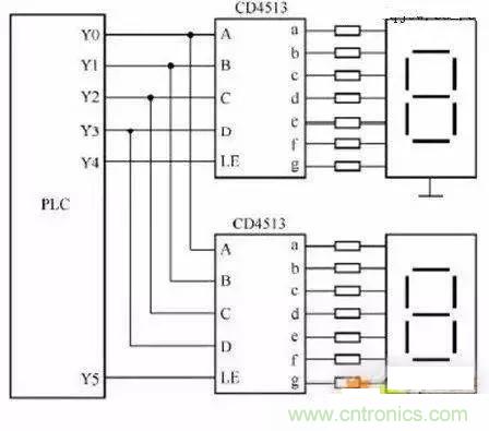 上圖兩只CD4513的數(shù)據(jù)輸入端A-D共用PLC四個輸出端Y0-Y3,A為最底D為最高,LE 為寄存輸入端,當LE 為高電平時,輸入數(shù)據(jù)將存在芯片內的寄存器中,并將其譯碼后顯示出來。如PLC使用繼電器輸出模塊時,與CD4513相連的輸出各端在接一個下拉電阻,避免輸出繼電器斷開的時候CD4513輸入端懸空。