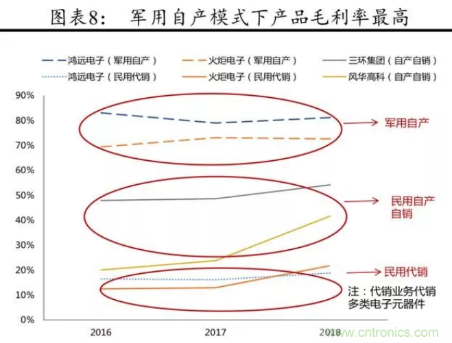 但自產(chǎn)自銷模式在民品領(lǐng)域的毛利率水平分化較大,在 20%~55%的較大毛利率分布 區(qū)間內(nèi)浮動(dòng)。擁有相對(duì)核心陶瓷技術(shù)的三環(huán)集團(tuán)的毛利率水平明顯高于風(fēng)華高科,兩者均受益于 2018 年的 MLCC 漲價(jià)潮,但風(fēng)華高科的毛利率水平的波動(dòng)顯著高于三環(huán)集團(tuán)。